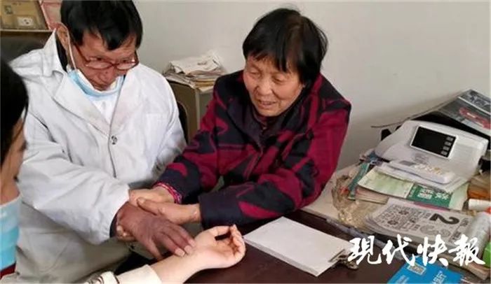 妻子扶著張又今的手幫病人搭脈。圖片來源:現(xiàn)代快報