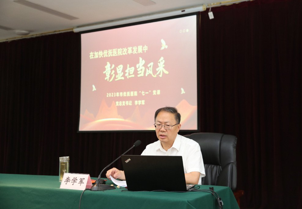 重溫入黨誓詞后,市優(yōu)撫醫(yī)院黨總支書記李學軍以“在加快優(yōu)撫醫(yī)院改革發(fā)展中彰顯擔當風采”為題,為醫(yī)院廣大黨員講授了“七一”專題黨課。李學軍書記結合醫(yī)院工作實際,分別從四個方面闡釋了當前一個階段在黨的領導下優(yōu)撫醫(yī)院的改革機遇、發(fā)展方向、應變之方以及具體實踐要求。一是恰逢改革機遇期。面對當前部委、省級改革發(fā)展政策,社會對心理精神健康要求不斷加大,醫(yī)療改革全面深度進行以及各地改革現(xiàn)狀,市優(yōu)撫醫(yī)院要緊抓機遇,乘勢而上。二是唯有發(fā)展生機無限。市優(yōu)撫醫(yī)院走過四十年風雨歷程,在不斷發(fā)展中茁壯成長,面對新的機遇要明確新的發(fā)展方向,要持續(xù)推動醫(yī)院實現(xiàn)設備從無到優(yōu)、治療方式從單一到綜合、大??菩【C合、養(yǎng)老與醫(yī)療結合的新方向發(fā)展,在改革中牢牢把握主動權。三是沖破藩籬天高地闊。要轉變思維方式、轉變發(fā)展格局、轉變工作作風、轉變管理方式,把新時代中國特色社會主義思想的世界觀、方法論和貫穿其中的立場觀點方法轉化為自己的科學思想方法,作為研究問題、解決問題的“總鑰匙”,在實踐中找到應變之方。四是正是彰顯風采時,要在實際工作中彰顯新時代優(yōu)撫人的擔當風采、帶頭風采、探索風采和奪旗風采,在加快優(yōu)撫醫(yī)院改革發(fā)展中砥礪前行。