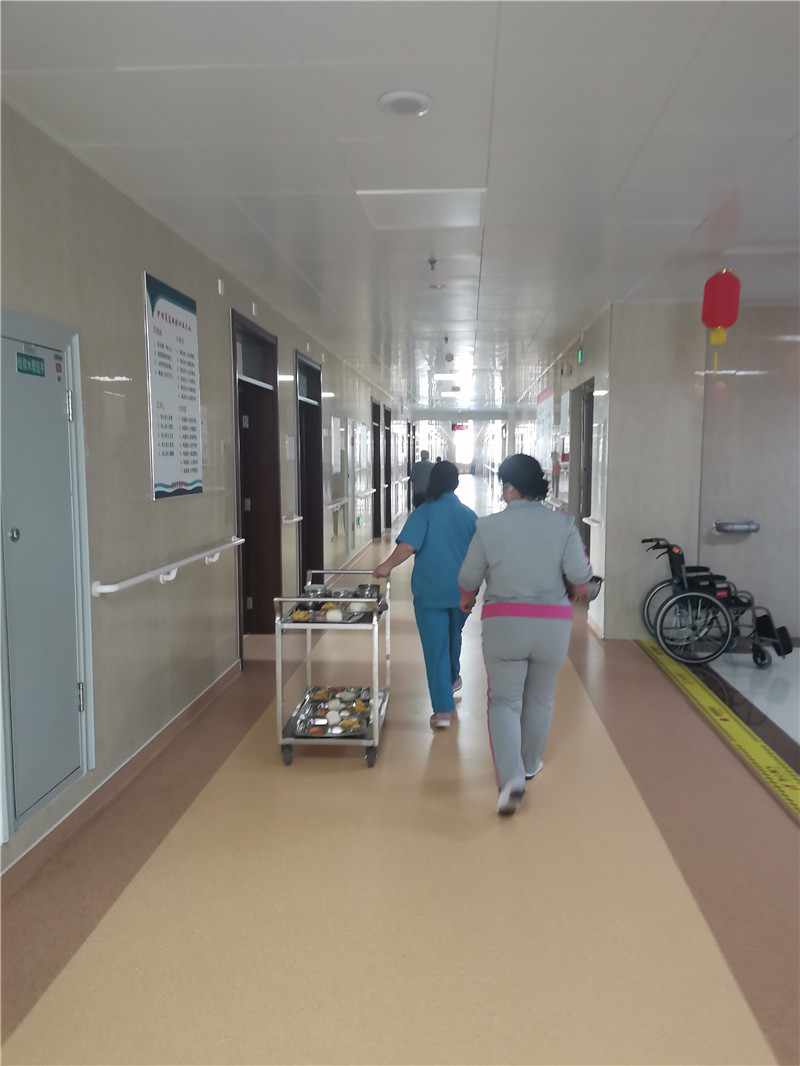 每天早晨6:30護(hù)理員們開始幫助老人分飯,然后把飯送到每一位老人的房間,老人飯后再去收拾餐具。