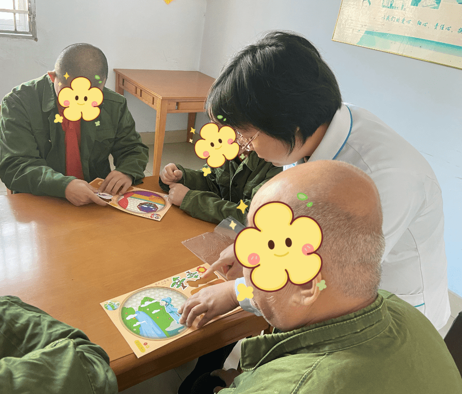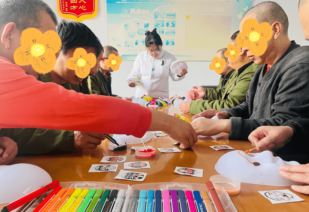 藝術(shù)創(chuàng)作轉(zhuǎn)移患者對(duì)病態(tài)體驗(yàn)的過(guò)度關(guān)注,減少焦慮與抑郁情緒;精細(xì)動(dòng)作訓(xùn)練(如握筆、裁剪)幫助恢復(fù)手部協(xié)調(diào)能力;集體活動(dòng)則重建社交信心:臉譜、書法等傳統(tǒng)文化元素激發(fā)患者對(duì)美的感知,增強(qiáng)文化認(rèn)同感。