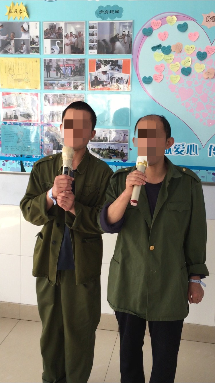 舒活舒活筋骨,抖擻抖擻精神。女病區(qū)帶著患者到籃球場跳起了廣場舞《小蘋果》,鳥兒給她們伴舞,迎春花兒為她們鼓掌。一病區(qū)組織患者在工娛療室完成了小合唱《歌唱祖國》,唱出了內(nèi)心的自豪與喜悅,表達(dá)了他們對(duì)祖國的熱愛與贊美。
