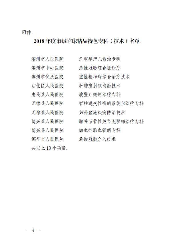 近日,濱州市衛(wèi)生健康委員會、濱州市發(fā)展和改革委員會、濱州市市場監(jiān)督管理局聯(lián)合發(fā)布全市10家市級臨床精品特色??疲夹g)名單,我院申報的“重性精神病綜合治療技術”名列其中。