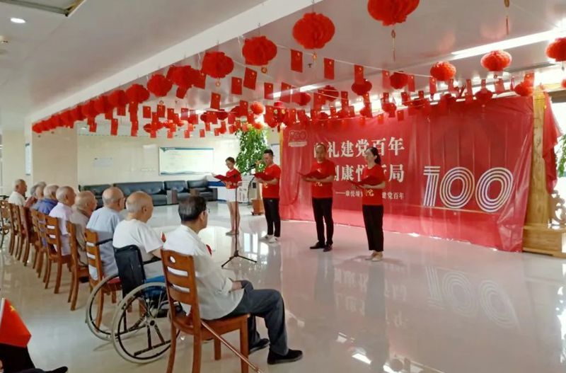 充分發(fā)揮老黨員的榜樣力量,后勤黨支部黨員走進老年人養(yǎng)護中心,為入住的老黨員佩戴大紅花,并通過合唱、朗誦、講革命故事等形式,與老黨員們一起追尋紅色足跡,歌頌黨的光輝歷程。在學習榜樣精神中,汲取前進力量,激發(fā)干事創(chuàng)業(yè)熱情。