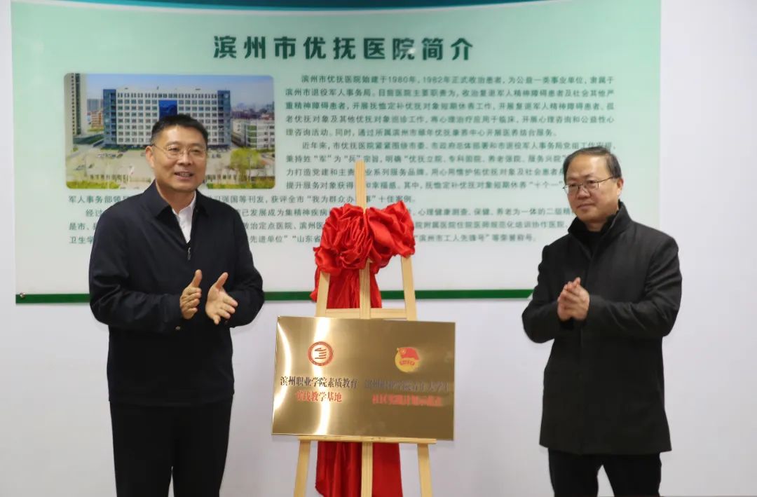 儀式上,由濱州職業(yè)學(xué)院黨委委員、副院長(zhǎng)王進(jìn)博與濱州市優(yōu)撫醫(yī)院黨總支書(shū)記李學(xué)軍共同揭牌。