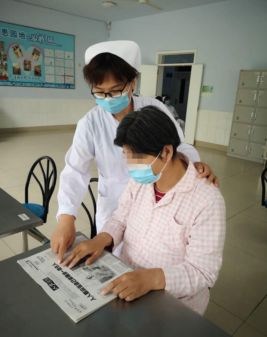 轉(zhuǎn)眼半年過去了,隨著季節(jié)的變換,小郭就像一只破繭的蝴蝶,發(fā)生了華麗的蛻變。床鋪疊放整齊、衣著干凈整潔,不愿說話的她不僅開始參與溝通交流,還每天給大家讀報紙,成了女病區(qū)的“讀報專業(yè)戶”。