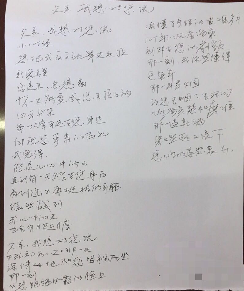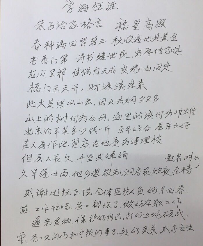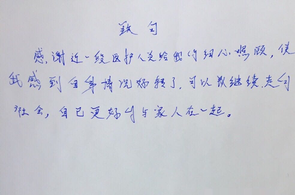 他們發(fā)自肺腑訴說著藏在內(nèi)心深處的感恩與憧憬。有的人寫給他年邁的父親;有的人寫給未來的自己;有的人寫給即將成家立業(yè)的兒女;有的人寫給我們醫(yī)護(hù)人員!他們嘴上雖然不說,不善于表達(dá)內(nèi)心的想法,但是字里行間透露著一股濃濃感恩之情!